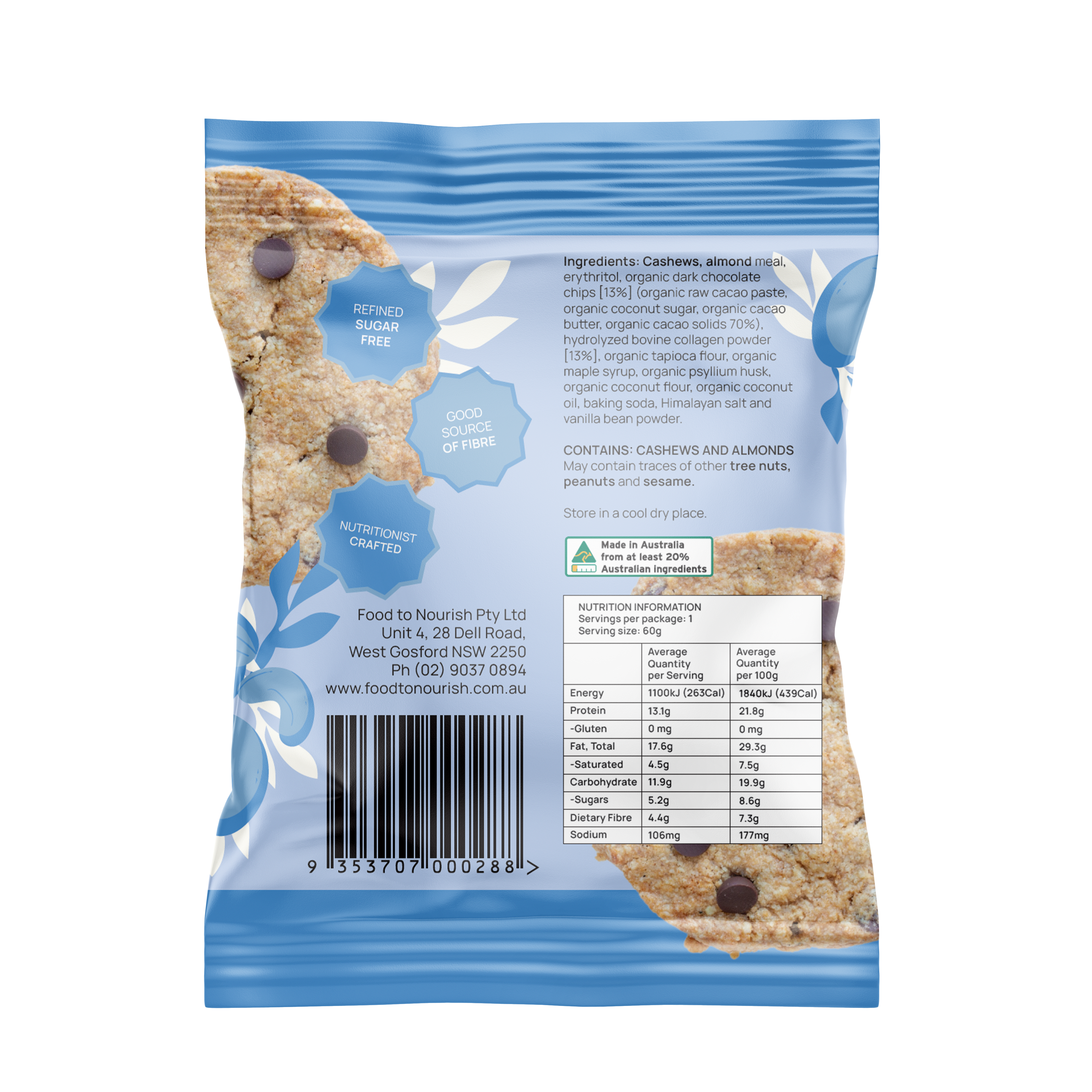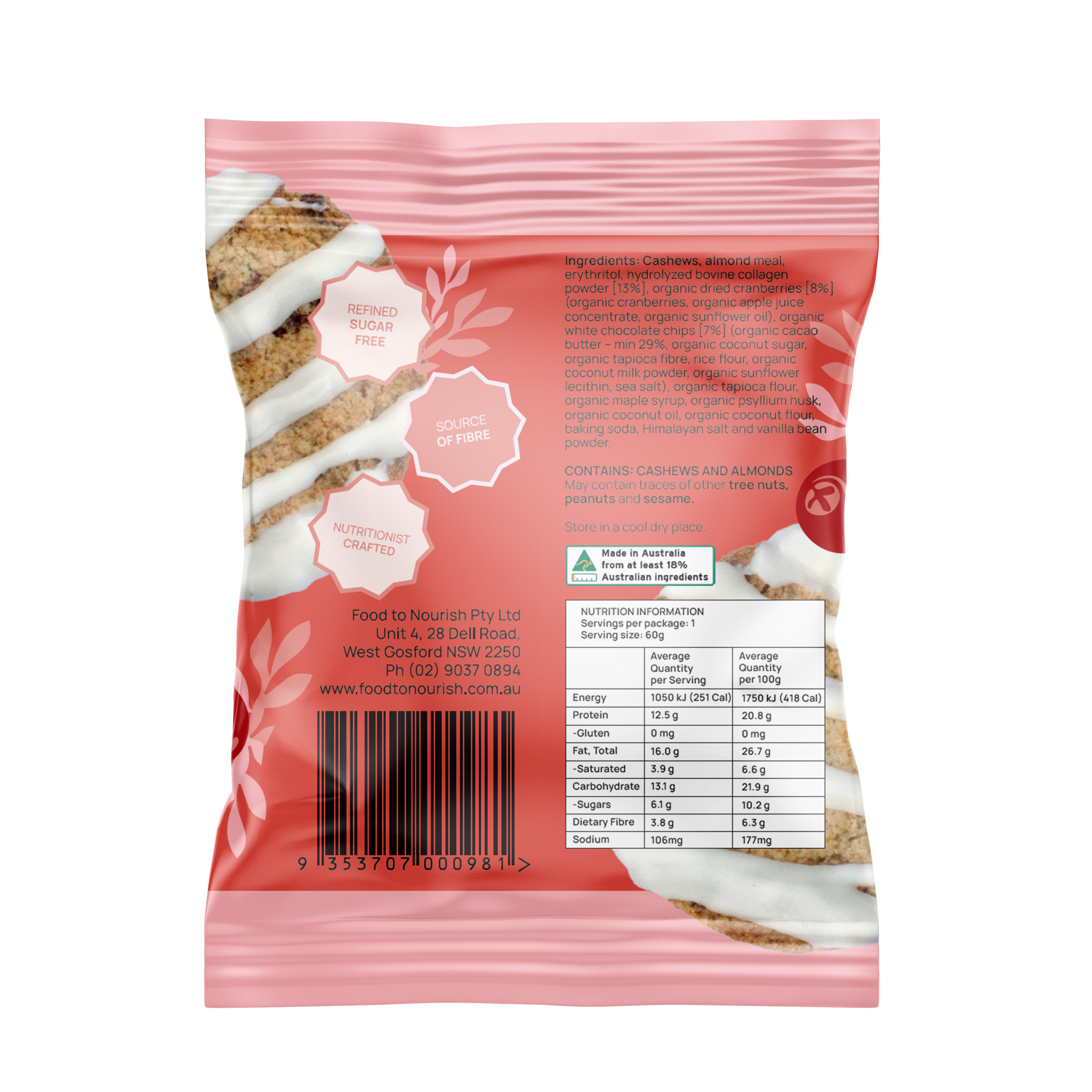 Cashews, almond meal, erythritol, collagen powder [13%], dried cranberries [8%]* (organic cranberries, organic apple juice concentrate, organic sunflower oil), white chocolate chips [7%]* (organic cacao butter – min 29%, organic coconut sugar, organic tapioca fibre, rice flour, organic coconut milk powder, organic sunflower lecithin, sea salt), tapioca flour*, maple syrup*, psyllium husk*, coconut oil*, coconut flour*, Himalayan salt, baking soda and vanilla bean powder.