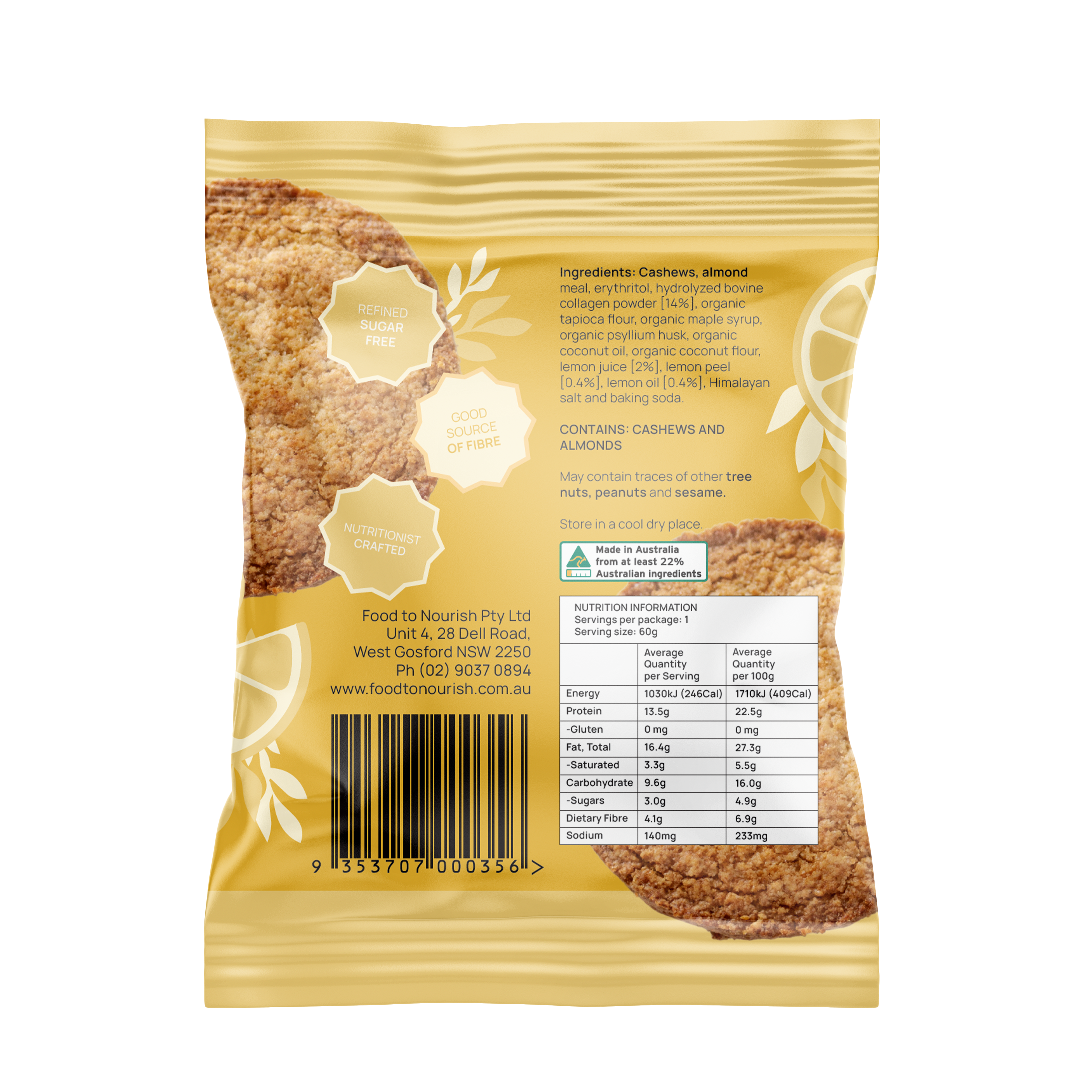 Cashew nuts, almond meal, erythritol & monk fruit blend, hydrolysed collagen powder, tapioca flour*, coconut oil*, maple syrup*, coconut flour*, psyllium husk*, lemon [2%], cold pressed lemon oil [0.5%], Himalayan salt & baking soda.